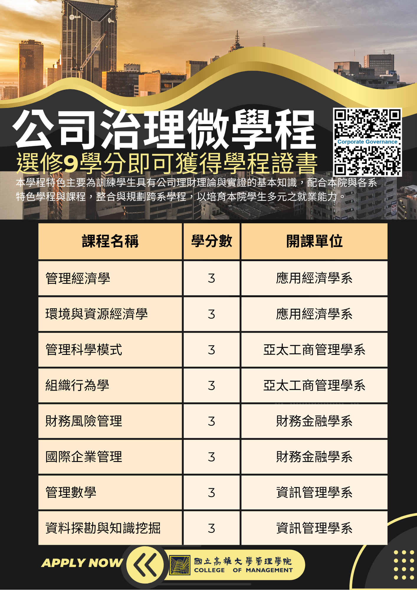 【公司治理微學程】完成 9 學分即可獲得學程證書,歡迎踴躍申請選修